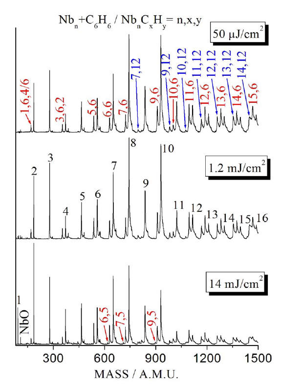distribution in the reaction of Nbn with ~1 mTorr C6H6