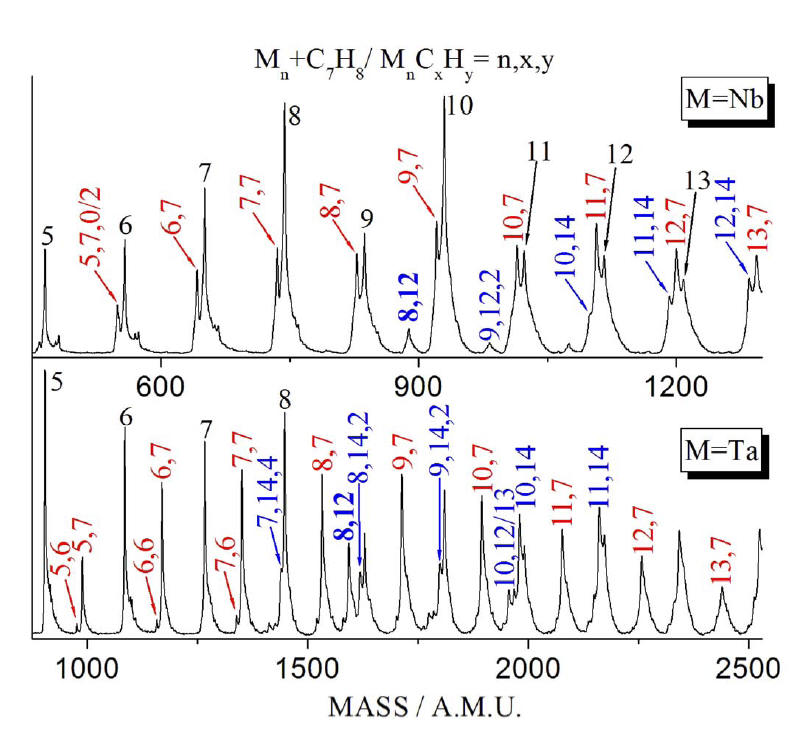 Metal (Mn) and metal oxide (MnOx) clusters are generated by laser ablation with a focused 532 nm Nd:YAG laser onto a metal disk in the presence of pulsed helium carrier gas or an O2/He mixture controlled by a R. M. Jordan supersonic nozzle. Metal and metal oxide clusters are formed in an adjustable length gas channel which is coupled directly to a tube/reactor. The reactant gases are injected into the reactor by a second pulsed valve (General Valve, Series 9). Reactions in the flow tube reactor are estimated to occur at near room temperature due to the large number of collisions between nano clusters and the bath and reactant gases. Ions are deflected from the molecular beam by an electric field and only neutrals enter the ion source of the time of flight mass spectrometer. Ionization is through DUV (193 nm, 6.4 eV), VUV (118 nm, 10.5 eV), and EUV (46.5 nm, 26.5 eV) laser radiation depending on the different clusters and reactants employed. Ions are accelerated and detected by a time of flight mass spectrometer, and signals are recorded and averaged by a digital storage oscilloscope or multi channel scaler.