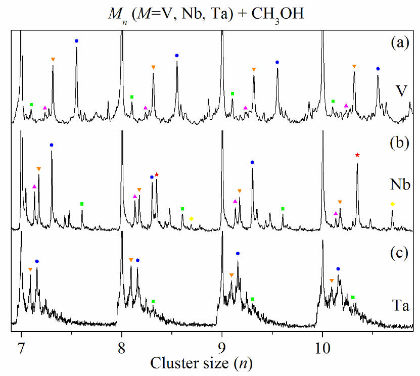TOF mass spectra for reaction of VmOn