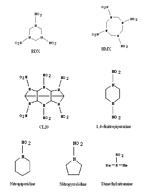 non-energetic model systems, including 1,4-dinitropiperazine, nitropiperidine,